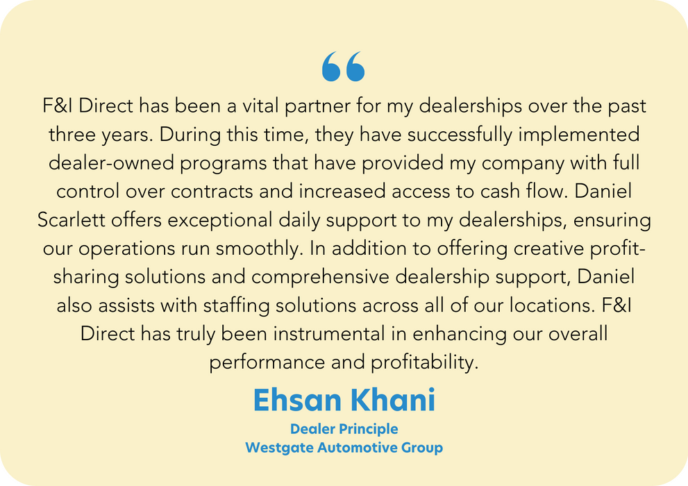 F&I Direct have been great to work with. Always professional, knowledgeable, and address any problems that come up quickly and efficiently. Can't recommend them highly enough!